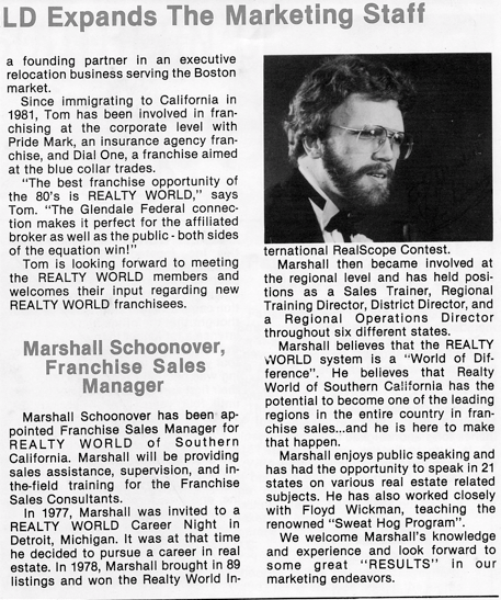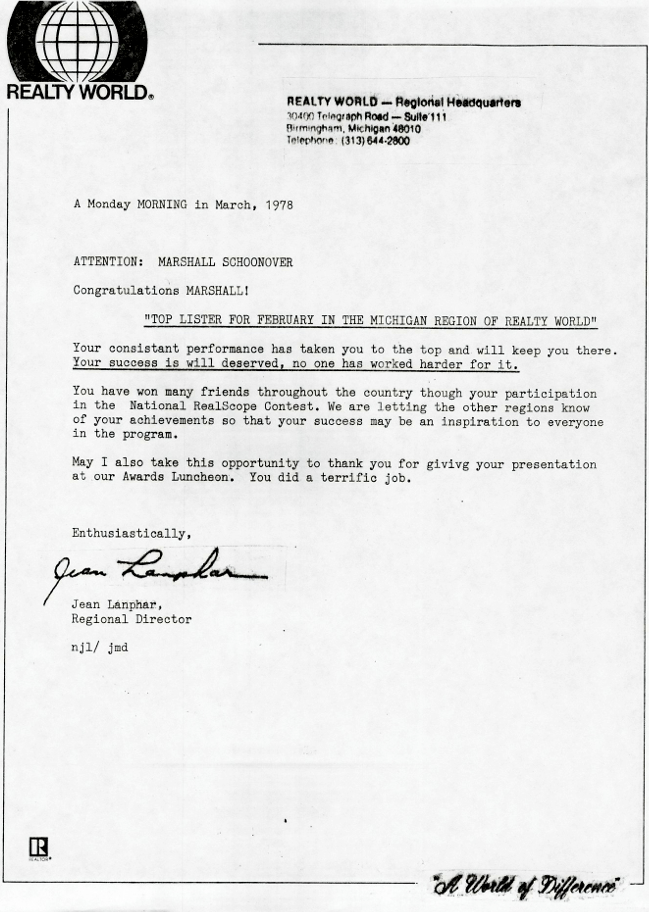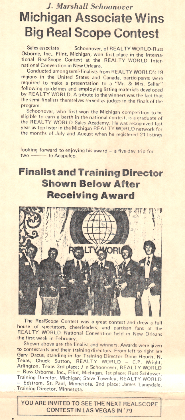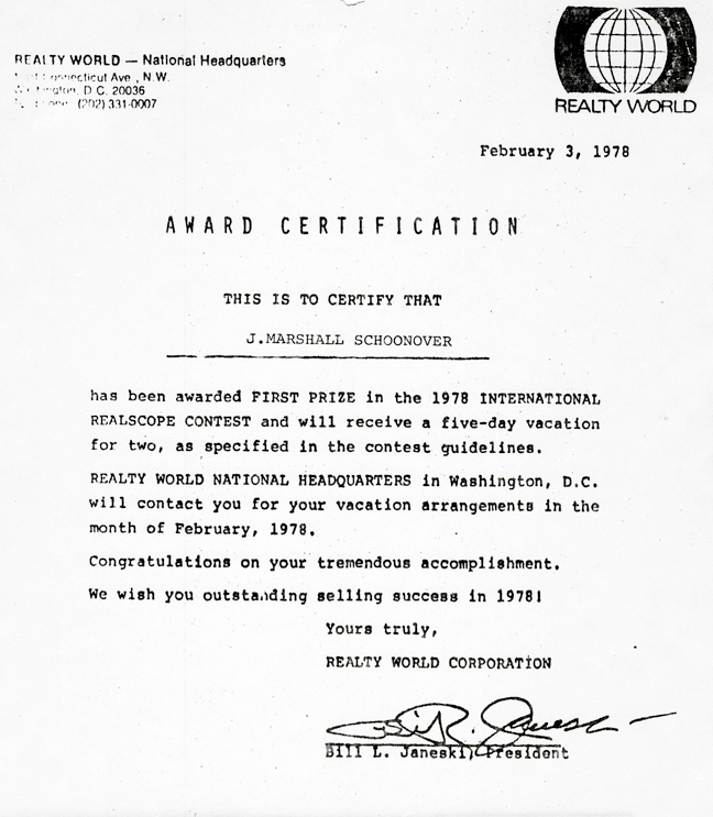 J Marshall Schoonover brought in 49 individual previously owned residential listings in his first six months in Real Estate and 89 listings in his first year. This was in a seller's market. In 1978, as a new salesperson, he won a Top International Award for his listing presentation that he gave in New Orleans competing with thousands of salespersons from all over the United States and Canada. Would you like to learn how he did it, so that you can do it too? Click here for more information!