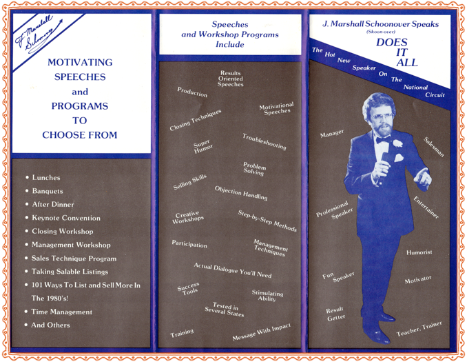 J Marshall Schoonover has in fact done it all. As a new real estate salesperson in 1977 he brought in 89 listings in his first 10 months in the business, in a seller's market. In 1978 he was the first person ever to be awarded with an International Award for his real estate listing presentation that he gave in New Orleans competing with thousands of salespeople from all over the United States and Canada. J Marshall has managed both residential and commercial real estate offices increasing production from 49% to 200%. He worked as a real estate recruiter in several different states conducting hundreds of career-nights and interviews. He was a Regional Training Director for a large real estate franchise in 12 different states over a six year period. He was a Regional Franchise Sales Manager for two large real estate franchises, responsible for the sale of many real estate franchises. He was a substitute trainer for Floyd Wickman, teaching Floyd's programs as a personal substitute trainer for Floyd himself, in seven different states, including Floyd's famous Sweathogs Program. He conducted a two-day real estate crash course for a large California real estate school called Real Estate Trainers 499 weekends over a thirteen year period.
