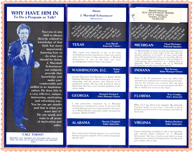 J Marshall Schoonover has done it all! J Marshall has given public speeches and sales training programs in 25 states in the United States. He has shared with his audiences his "results-getting" "thought-provoking" methods for being more productive in the field of selling as well as helping individuals pass both the California broker and salesperson's test the first time they take it.